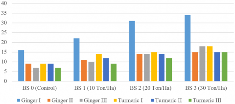 Giving bokashi fertilizer from cow dung is one way to overcome the lack of nutrients and organic matter in the soil so that it can support the growth of medicinal plants, in this case, ginger and turmeric. The growth indicator used to measure the effectiveness of the treatment given is plant height [10]. The results of observations made every day showed an increase in the height of biopharmaceutical plants 60 DAP for all treatments. Plant production is influenced by vegetative growth [11]. The most important nutrient in plant vegetative growth which is characterized by leaf growth is nitrogen [12]. Nitrogen plays a role in stimulating the vegetative growth of plants as a whole, especially the growth of roots, stems, and leaves [13].