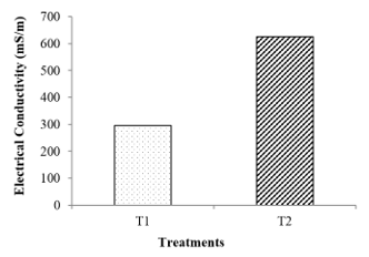 As depicted in Figure 1, the results of the present study showed that the electrical conductivity of compost T2 (625 mS/m) was about two times higher than that of compost T1 (296 mS/m). High electrical conductivity in compost T2 indicated that the compost contained a significant amount of soluble salt content [26, 27]. This reaffirmed with the salinity content of compost T2 (110 mg/L), which was higher than that of the compost T1 (100 mg/L). This showed that the addition of high amount of cattle manure as an inoculum to the composting digester would enhance the soluble salt content in the resulted compost. Also, electrical conductivity in compost T2 was extremely higher than that of the typical compost used as fertilizer in agriculture, which was between 200 and 350 mS/m [28, 29]. This suggested that compost T1 was quite readily suitable used as an organic fertilizer in agriculture uses.