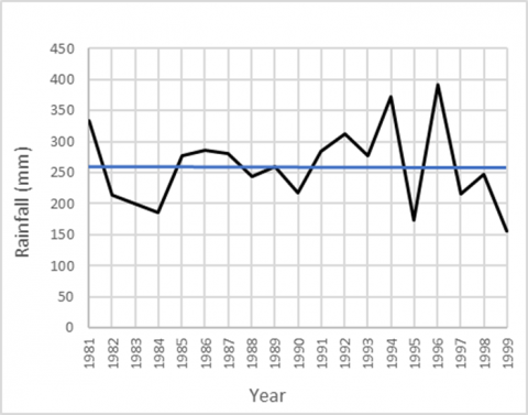 Figure 10. Trend line of annual rainfall for Lesser Zab for the period (1981-1999)