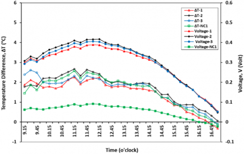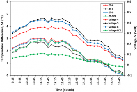 The Figure 14 shows a fluctuating temperature difference. This is caused by natural factors, namely the wind speed that hits the TEG module is not fixed so that it hits the hot-side of the TEG and also the thermocouple so that the temperature measurement readings on the hot-side are less than optimal. But overall, the temperature difference increases when the sun is hot and decreases as the sun goes down. This has an impact on the magnitude of the voltage that occurs.