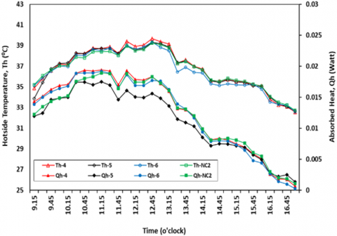 Meanwhile, Figure 11 shows the temperature on the hot-side and the heat absorbed by the TEG module. It can be seen that the higher the position of the sun, the overall temperature of the hot-side increases. Meanwhile, the heat absorbed by the object is fluctuating from 09.00 to 17.00 hours. This is due to unavoidable natural factors such as wind hitting the TEG module and the temperature sensor on the hot-side of the TEG which causes fluctuations. But overall still follow the intensity of the sun where if the sun is getting hotter, the heat absorbed is getting bigger. And vice versa, as the sun goes down, the heat absorbed decreases.