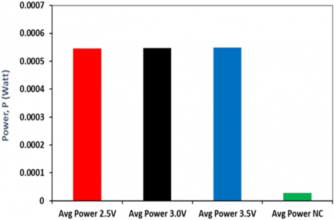 Figure 17 illustrates the output power of the TEG module which is immersed in voltages of 2.5V, 3.0V and 3.5V and without copper plating. The result is almost the same output power at various immersion voltages, whose values are 19.16, 19.22 and 19.27 times greater than without Cu coating and immersion at 2.5, 3.0 and 3.5 Volt immersion voltages, respectively. This figure indicates that the difference in immersion voltage does not have much effect on the energy generated by the TEG module, except when compared to the module without coating and immersion, the energy produced is very significant.