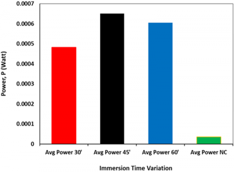 The duration of immersion in Cu solution gives a quite different effect of increasing the output power of the TEG module. In the Figure 18, this can be seen between the immersion time of 30, 45 and 60 minutes, where the immersion time of 45 minutes resulted in an 18.16 times greater percentage increase in the power output of the TEG module when compared to the module without coating. That is, immersion for 45 minutes shows the best TEG electrical energy output symptoms. The results of this study are in line with the objectives of the studies conducted in research [17, 25] which added a layer on the hot-side of the TEG module as a thermal energy absorber.