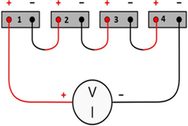 In data collection, the four modules are assembled in series and placed on the base surface of the heatsinks as shown in Figure 3. Schematically, the series circuit of the thermoelectric generator module can be seen in Figure 4.