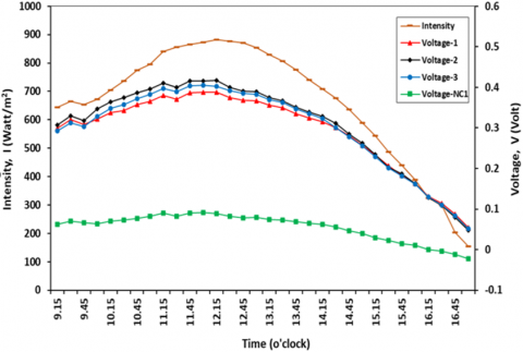 3.1 Intensity of solar (I) and output Voltage (V) for 2.5V electroforming immersion