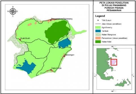 This research was conducted from November to December 2019 in Pahawang Island, Marga Punduh District, Pesawaran Regency, Lampung Province, Indonesia. Pulau Pahawang Island has five subvillages. The subvillages are Cukuh Nyai, Suak Buah, Penggetahan, Jeralangan, and Pahawang [13]. The reason for choosing the location is because the subvillages are close to each other, and the people in the hamlet manage their land with an agroforestry system. The map of the research location is presented in Figure 1.