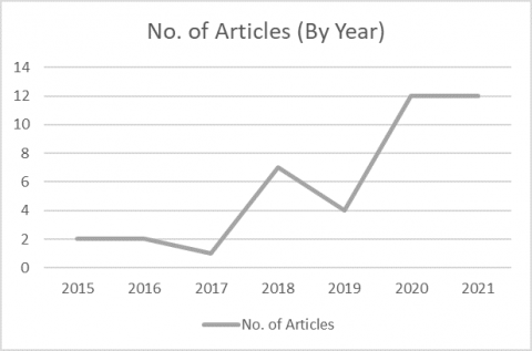 Regarding research methods shown in Figure 6, 25% of the articles (10) employed quantitative methods, while 48% of the articles (19) employed qualitative methods. 27% of the articles (11) used both quantitative and qualitative methods.