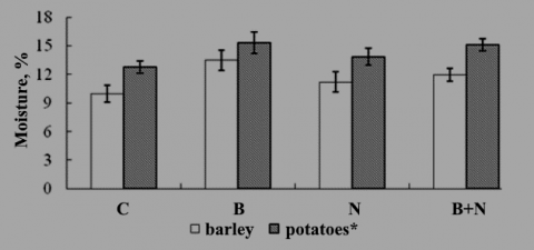 The soil moisture content plays an important role in the management of soil processes. This indicator is one of the limiting factors for high crop yields. The moisture content of the soil depended significantly (p<0.05) on rainfall, air temperature, and crop cultivation agro-technology. The dynamics of humidity showed that the introduction of biochar into plots with barley significantly increased this indicator (p<0.05), on average, by 1.3 times during the growing season. The introduction of azophoska resulted in an insignificant increase in soil moisture, while the application of biochar and nitrogen fertiliser together significantly increased (p<0.05) soil moisture during the growing season, but the differences with the soil variants where biochar and azophoska were applied separately were not significant, they are shown in Figure 1. The introduction of the studied biochar, azophoska and their combinations under potatoes and under barley increased soil moisture, on average during the growing season by 1.2, 1.1 and 1.2 times, respectively. The demand of this crop for water is greater than that of cereals, and biochar contributed to maintaining moisture in the soil during the growing season in comparison with soil without biochar. Earlier studies on the influence of biochar on the change in the basic hydrophysical characteristics have shown that biochar contributes to an increase in water retention capacity due to its high porosity and aromatic structure [18].