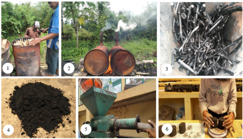 Figure 2. Stages of making charcoal briquettes. 1. Raw materials were put into the drum, 2. Process of coking cassava and bamboo sticks, 3. Results of coking, 4. Charcoal powder after grinding and sifting 40 mesh, 5. Briquette manufacturing, and 6. Finished and dried briquettes