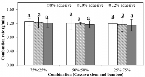 Figure 6. Effect of briquette combination and adhesive concentration on combustion rate of charcoal briquettes (different letters within a combination show significant different at a 5% significance level between adhesive content using Duncan’s multiple-range tests)