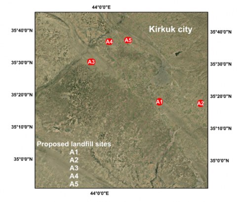 -An aerial photograph of Kirkuk Governorate for the year 2019 with a resolution of (5m*5m), obtained from the Urban Planning Department, showing the proposed landfill sites.
