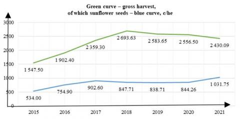 As for the collection of oilseeds, despite the increase in the area of crops, the harvest has been decreasing in recent years. Since 2018, the harvest has decreased by 10%. Such results are likely to be related to global climate change. This issue requires further research. In general, over the period 2015-2021, the collection of oilseeds increased by 57%, in particular, this is due to an increase in sown areas (Figure 2).