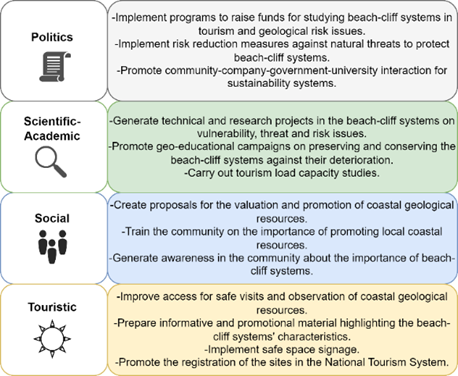 The SWOT analysis allowed the configuration of various strategies to improve the management of the beach-cliff systems in the study. The strategies were proposed based on the Strengths-Opportunities, Weaknesses-Opportunities, Strengths-Threats, and Weaknesses-Threats. This work suggests a comprehensive management model focused on the political, academic-scientific, social and tourist aspects to achieve their protection as natural landforms and, in turn, promote responsible and safe tourism in each sector (Figure 18). For its effective development, articulating inter-institutional and interdisciplinary working groups with the participation of local governments, higher education institutions, the community and public-private sector companies is essential.