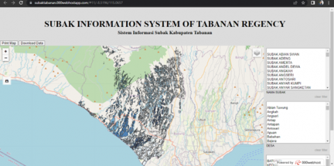 The last features are map printing and data download that allow users to obtain subak data and maps. The primary user of the developed web GIS is the Tabanan Office of Agriculture and related offices in the regency. With the map print feature, users can print a map in a PNG format according to the display on the system. Meanwhile, the download feature produces data in a GeoJSON format. This web GIS is published on a free hosting site to help the Office with cost-effective maintenance. It can be accessed at this address https://subaktabanan.000webhostapp.com/.