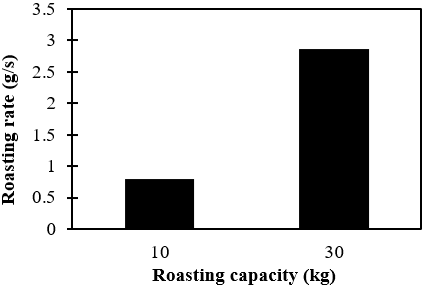 Meanwhile, Figure 8 presents performance of the roaster, i.e., roasting rate, load useful heat, specific energy consumption (SEC), and effectiveness. From the graphs in Figure 8, it can be stated that performance of the roaster is better while roasting 30 kg fresh maggot than while roasting 10 kg fresh maggot. The values of roasting rate, useful heat, and effectiveness of 30 kg roasting capacity are higher than that of 10 kg roasting capacity. On the other hand, the value of SEC for 30 kg roasting capacity is lower than SEC for 30 kg roasting capacity. These results are as expected since the roasting capacity design is 50 kg. The roasting rate for roasting capacity of 10 kg and 30 kg are 1.79 g/s and 2.86 g/s. Useful heat for roasting capacity of 10 kg and 30 kg are 17392.22 kJ and 62168.30 kJ. Useful heat is defined as total heat from the furnace which is absorbed by the drum to dry the maggot inside the drum. The effectiveness of the roaster is found to be 0.57 and 0.69 for capacity of 10 kg and 30 kg. Whereas the SEC are 30838.84 kJ/kg water vapor and 12798.78 kJ/kg water vapor for roasting capacity of 10 kg and 30 kg, respectively. SEC is defined as the amount of energy required for evaporating 1 kg of water vapor. The lower the SEC, the better the performance of the roaster. Lower SEC means that to evaporate same amount of water requires lesser energy, hence more energy efficient.