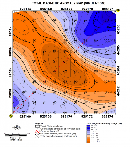 The simulation uses a geomagnetic method to analyze the magnetic properties of a test excavation that includes magnetite and iron ore. The dimensions of the test pit are 2.5 meters in length, 1.2 meters in width, and 2 meters in height. The composition comprises particles of magnetite iron ore. The object, consisting of magnetite iron ore, has a volume of 2 cubic meters and has been confirmed to have a Fe content of 97.12% by geochemical analysis. The simulation included the use of two GSM 19T magnetometers, which were placed at a separation distance of 1 meter. Data collection started at an initial location and concluded at the same destination. The primary aim of the study was to measure the variations in the magnetic field caused by the presence of magnetite iron ore.