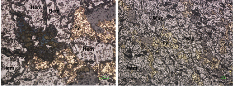 Figure 10. The validation of iron ore body indications through mineragraphy analysis, which identifies the presence of hematite and magnetite minerals