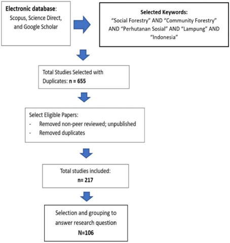 The database for this article was prepared in two stages, namely searching databases from international journals and national journals. International journals were explored using SCOPUS and SCIENCE DIRECT and national journals were searched using GOOGLE SCHOLAR. In searching the database we used the Boolean operator concept using the keywords "Social Forestry", "Community Forestry" and "Indonesia" for the international database, and "Social Forestry" and "Lampung" for the national database.