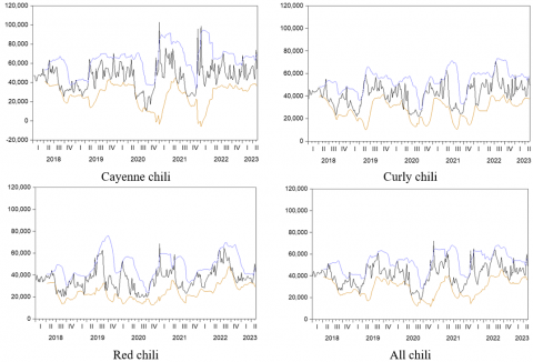 Differentiated by type of chili, on average, the price of cayenne chili per kg during the observation period was the highest compared to curly chili and red chili. The standard deviation shows that the cayenne chili price has the highest price risk. Figure 2 shows the prices of cayenne chili are very volatile. The price gap between the lower and upper bands is vast. Compare to other chilies, cayenne chili price is more volatile. The volatility of chili prices, especially cayenne chili, can be analyzed from the production side and the consumption side. From the supply side, there is a high disparity across regions. At the aggregate level, the majority of the cayenne chili area (around 61%) is only in four provinces out of 34 provinces in Indonesia in 2022, namely Central Java, West Java, East Java and DKI Jakarta. Any disruption in chili production in one or more key regions may lead to a significant impact on national supply and prices. This interplay of regional production capacities and challenges directly contributes to the volatility of chili prices on a national scale. In a smaller scope, this condition will have an impact on price fluctuations at the provincial level. For red and curly chili, production disparities between regions are relatively lower. From the consumption perspective, the elasticity of substitution for red versus curly chili is greater than for cayenne versus red chili, which explain why red and curly chilies are relatively stable in consumption. In addition, household participation rate and per capita consumption of cayenne chili are higher than red chili, influencing the degree of price fluctuations following production shocks. The dynamics between consumption patterns and production levels play crucial roles in determining price volatility.