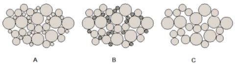 Figure 2. Progression of suffusion. (A) The fine particles attached with coarser particles with a seepage line (B) The starting of suffusion influenced by seepage and (C)The suffusion in which the fine particles flow with the seepage creating the voids [17]