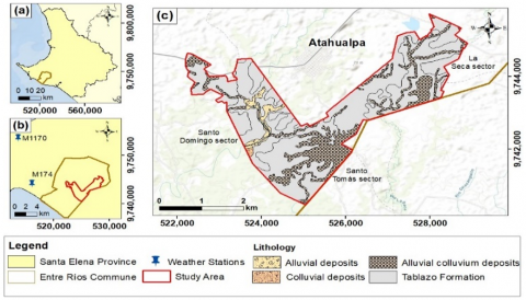 Figure 1. The study area map (a) Santa Elena province; (b) Entre Ríos commune, study area and meteorological stations; (c) Lithological map of the study area