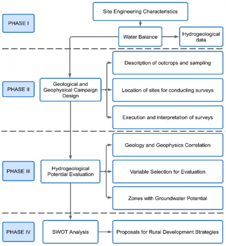 The method was based on generating thematic maps (lithology, resistivity, texture, slope, drainage density and precipitation), their reclassification and subsequently weighted overlay using AHP and GIS tools to prepare a GWPZ map [38]. In addition, strategies are established based on a SWOT analysis, focused on sustainable water management and WS&H techniques for rural agricultural development. The methodological approach had four phases: i) site engineering characteristics, ii) design of the geological and geophysical campaign, iii) evaluation of the hydrogeological potential, and iv) SWOT analysis and proposal of strategies for rural development (Figure 2).