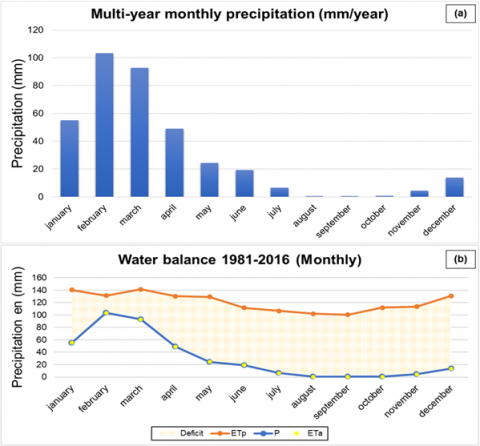 Figure 3. Multitemporal precipitation analysis 1981-2016 (a) Multi-year monthly precipitation (mm/year); (b) Water balance