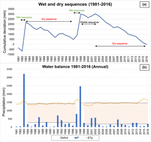 Figure 4. Annual analysis 1981-2016 (a) Wet and dry sequences; (b) Annual water balance
