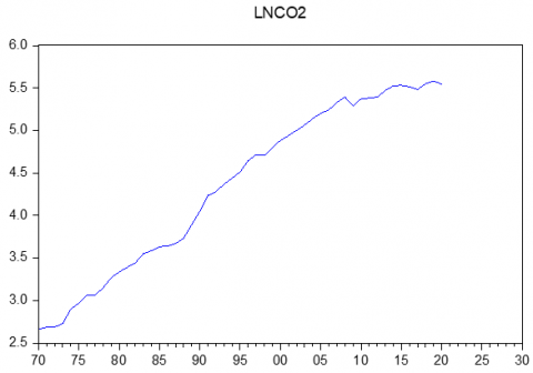 This ARIMA forecast method is chosen to predict Malaysia’s CO2 emissions from 2021 to 2030. However, this ARIMA is the technique that will be discussed in this section in order to analyse study objective which is "To forecast the level of carbon dioxide (CO2) emissions that will be released in Malaysia over a ten-year period from 2021 to 2030.” To implement Automatic ARIMA Forecasting in EViews, we first obtained CO2 emissions data in million tonnes and explored the data to identify the best transformation method. After testing different transformations, we decided to log-transform the data, which we found to be the most suitable for our specific case in Malaysia.