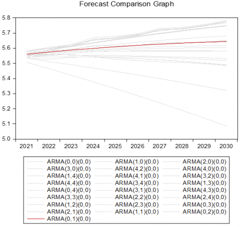 In the implementation of automatic ARIMA forecasting, forecast comparison graphs are an essential tool for assessing the accuracy of forecasting models. Figure 3 shows the some of the selected ARIMA model that relevant to the LNCO2 series. Based on Figure 3, the ARMA (0, 1) model is the best among all the models, represented by the red line in the graph.