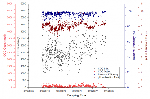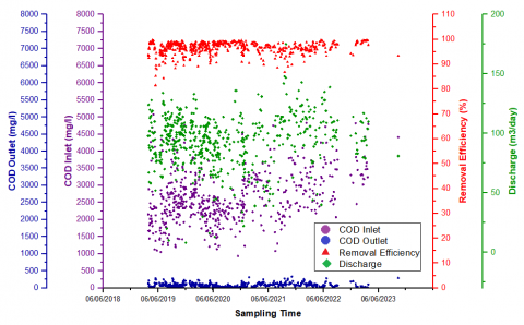 After the wastewater treatment process stabilized, periodic analysis of the COD (chemical oxygen demand) concentrations at the inlet and outlet was conducted until June 2023.