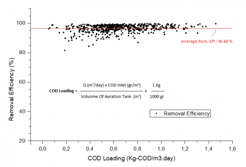 Additionally, when designing the activated sludge wastewater treatment plant, it is easier to determine the volume requirements for the aeration tank when using data or graphs that show the relationship between organic load (COD) and removal efficiency, especially when treating nata de coco wastewater.
