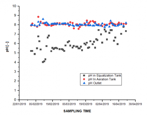 Figure 8. Graph of wastewater pH in the equalization tank, aeration tank inlet pH, and IPAL outlet pH (February-April 2019)