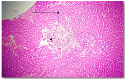 Figure 5. The histological slice of the chitosan-treated liver revealed: A) Inflammatory lymphatic infiltrate within portal area, B) Sinusoid were filled with kuppfer cells