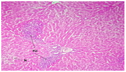 Figure 9. The histological slice of the liver treated with Nystatin and C. Krusei revealed: FLI) focal lymphocytic infiltration in the portal area. N) Some necrotic cells are observed