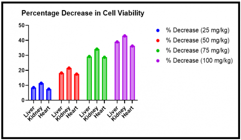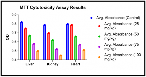 After the dosing period, mice were euthanized, and organs of interest (liver, kidney, heart) were harvested and homogenized to prepare cell suspensions. The cell suspensions were then subjected to MTT assay to assess cell viability. The absorbance was read at 570nm using a microplate reader. Details on the MTT cytotoxicity assay conducted. Indeed, the viability of the cells in suspension was confirmed by trypan blue exclusion, Trypan blue is a vital dye that can be used to differentiate viable cells from non-viable cells. The process involves staining the cell suspension with trypan blue, which is taken up by non-viable or dead cells, causing them to appear blue.