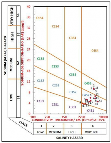 -USSL diagram suggested that the groundwater samples belonged to C4S3, C4S2, and C4S1 categories, indicating high saltiness and high to medium to low sodium hazard. The findings show that the samples are not suitable for crop watering.
