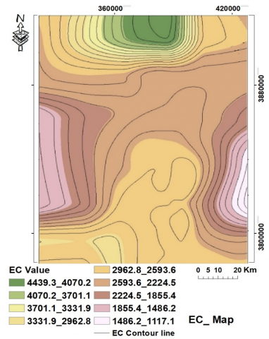 Figure 5. A contour map of the electrical conductivity of groundwater in the study area