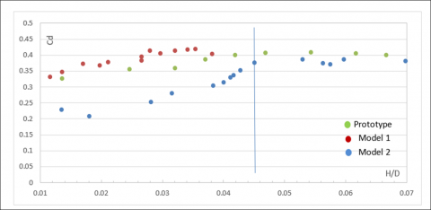 Figure 12. Relationship between Cd and H/D for Model 1, Model 2, and prototype