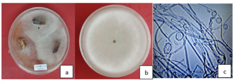 Figure 1. Planting cocoa rot samples on V8 Juice media (a), colonies of P. palmivora (b), microscopic visualization of P. palmivora (c)