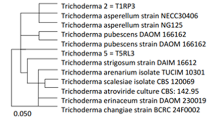 Based on phylogenetic analysis aligned with the database at NCBI isolate T1RP3 and isolate T5RL3 have a closer relationship to T. asperellum (Figure 2).