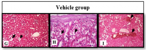 The earlier results align with the current study's findings, which reported similar biochemical and histopathological changes after administering the GLY solution [24]. The vehicle-treated group didn’t produce any significant changes compared with the induction group, which was attributed to the absence of protective effects of the vehicle Solution. In contrast, LQ-treated groups showed a significant reduction in renal function parameters (urea and creatinine) and CK levels, compared with the induction group, as well as attenuation of histological changes, as the LQ-treated groups significantly improved the structural changes presented in the GLY group, suggesting possible renoprotective effects, mitigated GLY-mediated AKI as well as attenuating the RML progressing in a previous study showed a remarkable reduction in both urea and creatinine levels in the cisplatin-induced AKI model, which supports our findings [22].