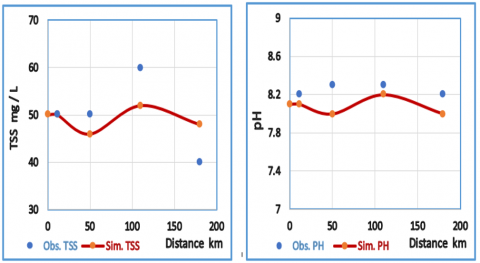 Figure 10. Relation between observed and simulated (TSS and pH) for Euphrates River Water - During the first