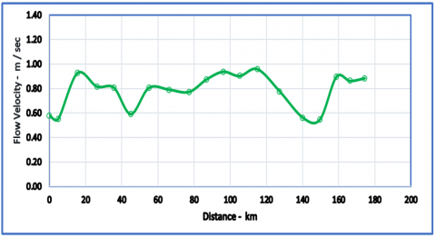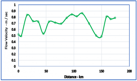 Figure 7. Flow velocity of Euphrates River within the study area in (m/sec) - April (2024)