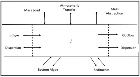 where, U: mean velocity (m/d); A: cross sectional area (m2); E: the coefficient of the longitudinal dispersion (m2/d); C: the concentration (g/m3); V: volume (m3); X: distance (m); S: the sinks and sources of constituent due to the mechanisms of reactions and the mass transfer (g/m3/d). This governing equation is solved by the QUAL2KW model under a steady state assumption for a concentration of water quality variables (Ci) in the water column for a segment (i) (Figure 3).