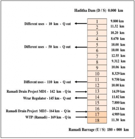 The 180 km of the Euphrates River reach from 0.00 km downstream of Haditha Dam to 180.00 km upstream of Ramadi Barrage was divided into eighteen segments with unequal distance or length (Figure 4). The discharge and location with distance for point sources (Inflow-outflow) were listed in Table 1. To express the relationship between flow discharge and the water depth, the Manning equation was used [22]. The cross sections obtained from the Studies and Design Center of the Ministry of Water Resources, which were collected as data in 2023, and drawn in the Excel program.