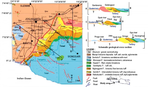 Geologically, the basin spans approximately 20 km in width and 45 km in length, extending from Yogyakarta City to the Indian Ocean. Its formation began in the Cenozoic era, resulting from volcanic extrusions from the Kulon Progo and Southern Mountains. Since the Oligo-Miocene period, these processes have shaped the region into a volcano-tectonic depression [45, 46]. Figure 2 illustrates the geological framework of the Yogyakarta Basin.