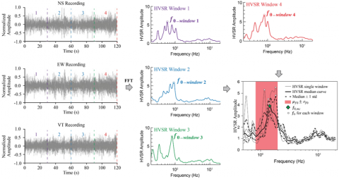 Figure 4. The schematic illustrates the typical process of deriving a median HVSR curve and its peak frequency from multiple ambient noise time windows