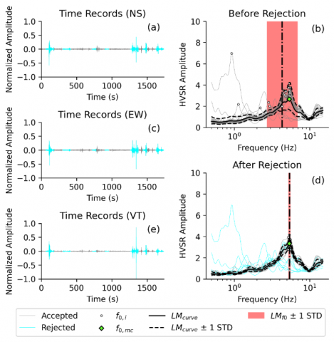 Seismic investigations increasingly rely on the resonant site frequency derived from HVSR analysis. However, the variability of ambient noise and environmental conditions introduces uncertainties in the determination of resonant site frequency, which can be categorized as temporal, azimuthal, or spatial [14, 35]. Temporal variations can affect the HVSR curve’s amplitude and shape and lead to deviations in resonant site frequency [36]. Additionally, the installation quality of equipment significantly influences the accuracy of HVSR measurements. Errors arise from the effectiveness of sensor isolation and sensor-ground coupling, which can contribute to uncertainties in determining the resonant site frequency [37, 38]. To address these challenges, a new method that combines log-normal distribution (LD) and automated frequency domain window rejection (AFDWR) has been developed to improve HVSR analysis. LD enables the smooth conversion of HVSR statistics from frequency to period, which is highly beneficial in earthquake engineering. AFDWR reduces variance and enhances data quality by effectively identifying and rejecting noisy windows [14, 35].