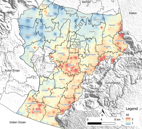 Figure 7. Map of the peak amplitude of HVSR (A0) in Yogyakarta Basin